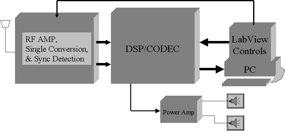 The hardware circuitry of the Software Radio is composed of the receiver Mixer, I.F., and Detector stages shown in Figure 3.1. The DSP, which is a Motorola DSP56002EVM board, a store bought set of PC powered speakers, and the LabPC circuit board which is installed in the PC, provides the interface for Labview.