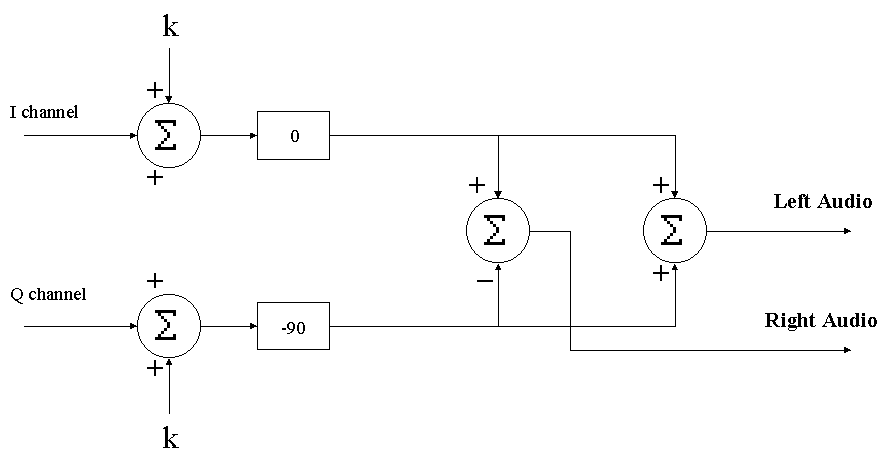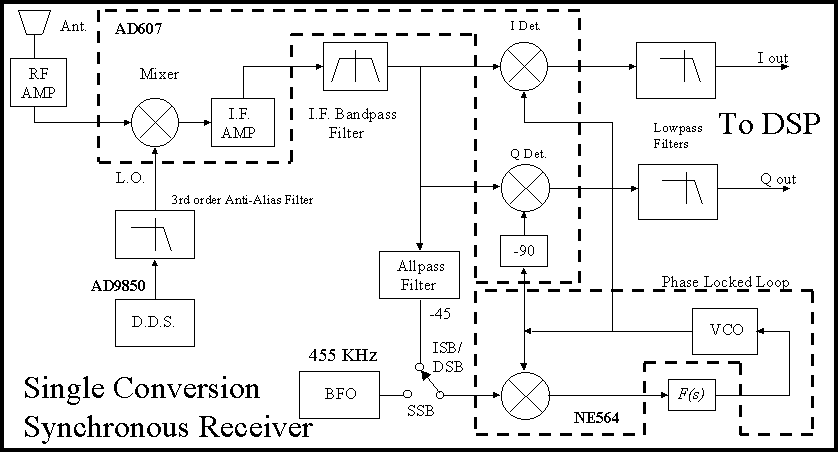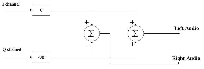 The I and Q detectors produce the product of the 455 KHz I.F. signal, and the output a PLL Voltage Controlled Oscillator produce a demodulated signal at the output of the two Product Multipliers. One output is 90 degrees out of phase from the other. The quadrature output arrangement permits the use of phasing techniques to further demodulate these signals. In 1956 Norgaard described the Phasing Method of Single Sideband (SSB) Generation. This method was not to popular when only tubes were available to build hardware because of stability issues. However, with today's technology this technique proves quite efficient in demodulating Single Sideband and Independent Sideband. This technique will be utilized in the Software Engine to perform this signal processing, and is discussed in section 2.5.