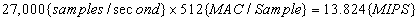 The CODEC communicates with the DSP through the Synchronous Serial Interface port. This port must be synchronized with actions being processed in the DSP. As a result there is a Frame Sync loop which synchronizes the program to the data stream (real time audio) coming in. The filter algorithm must be finished before the processor goes back to check for the next data sample. Otherwise, the filter will not be correctly executed. This is where the processor speed becomes important. This is a 20 MIP machine as configured with internal clock running at 40 MHz. MIPS (Mega-instructions per second) in a DSP mean number of multiply-accumulates that occur in one sample. If you are doing fewer MACS (Multiply Accumulate) than 20 MIPS, then the system will work correctly. (In this processor a MAC takes two clock cycles) In this case the requirement is: