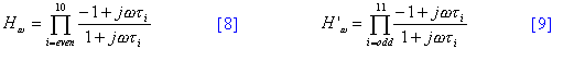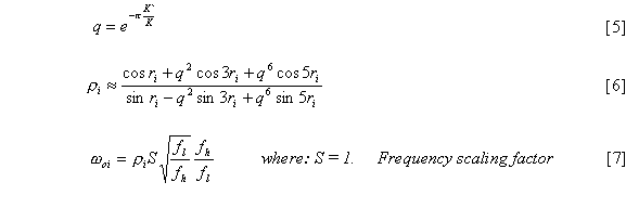 Equations 8 & 9 culminate the development of the derivation into two 6th order filter functions. [8] is the –90 degree network function of Figure 4, and contains the poles of even order denoted as the subscript i. [9] is the –180 degree network function of Figure 4, and contains the odd order poles as denoted by the subscript i. The range variable i goes from 0 to 11.
