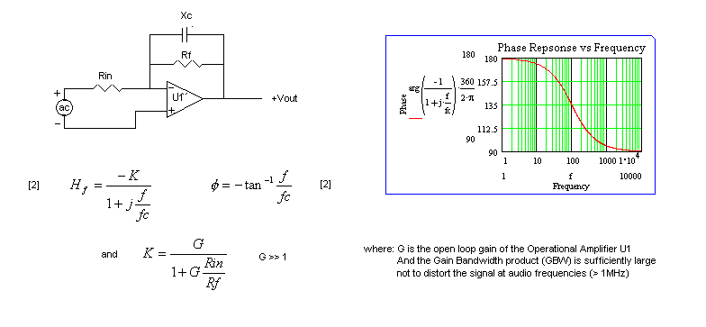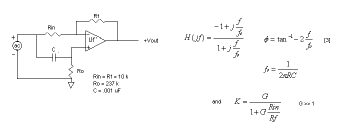 If a modification to this circuit is made as shown in Figure 3, the transfer function of [2] becomes [3]. The magnitude response of this filter is constant unlike that of the low pass filters in Figures 1 & 2, however the phase still varies. The phase response of the filter lags the input by 180 degrees over the response of the filter. The phase response is –90 degrees out of phase with input at the corner frequency of 672 Hz as shown in Figure 3B. This is called an active Allpass filter. It is called Allpass for its ability not to effect the amplitude of the signal but modify only the phase of the signal.