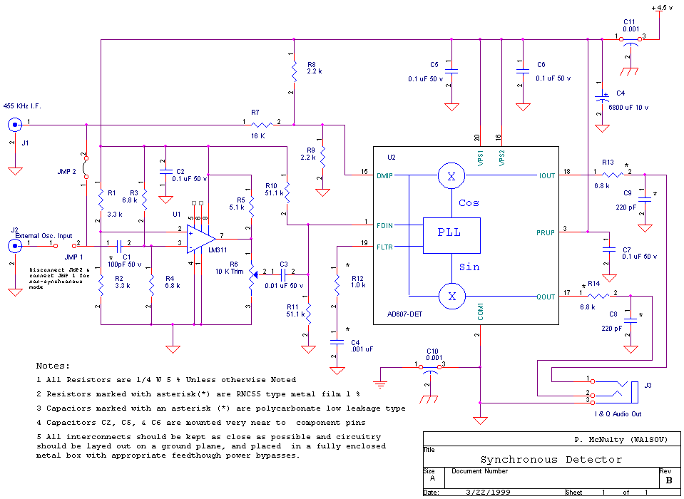 A Synchronous Detector designed with the use of an LM311 and an Analog Devices AD607. This is a very basic design. It functions as a product detector and when JMP2 is closed and JMP 1 is open, it functions fully synchronously locking to the 455 KHz I.F. provided at the input. The 455 KHz input should be pre-filtered to remove unnecessary noise from the signal so as to improve locking performance. This circuit has been tested with a Hammerlund SP-600, and it functions quite well with the I.F. out of this receiver connected to J1 of this circuit. Most of the testing has been done with the SP-600 in its 8 KHz position however, any of the passband selections work fine. The narrower the bandwidth selection the better rejection there is against unwanted adjacent channel interference. Additional I.F. selectivity can be had by filtering just the signal provided to U1 and not the I.F. sent to U2. This is not shown below but can easily be implemented. Further improvement could be had, by regenerating the carrier with a Phase Locked Loop such as the NE564. This is necessary for use on signals with marginal carrier signal or suppressed carrier. The loop filter designed for use with such a PLL would provide much greater rejection of unwanted adjacent channel noise. This is an experimental breadboard and is by no means a polished performer. It does afford the experimenter the opportunity to play with a configuration that can provide synchronous detection. Have Fun!